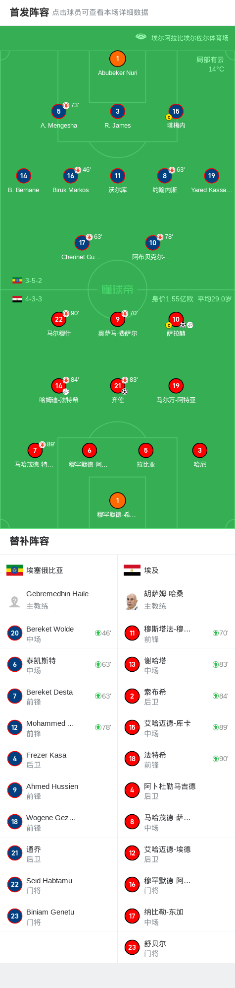 埃及客场2-0埃塞俄比亚,萨拉赫传射,齐佐建功战报bot2025-03-22 06:53世界杯非洲区预选赛小组赛第5轮,埃塞俄比亚与埃及展开较量。比赛中,埃及凭借团队配合取得领先,哈姆迪-法特希为萨拉赫送出精妙助攻,后者成功破门。随后,萨拉赫投桃报李,助攻齐佐再下一城,进一步巩固优势。全场比赛结束,埃及以2-0的比分战胜埃塞俄比亚,顺利拿下三分。点击查看本场比赛详细数据>>点击查看非洲预选完整积分榜>>精彩瞬间第31分钟,埃及球员哈姆迪-法特希助攻萨拉赫打入一球。第40分钟,埃及球员萨拉赫助攻齐佐打入一球。 球队阵容 技术统计展开更多