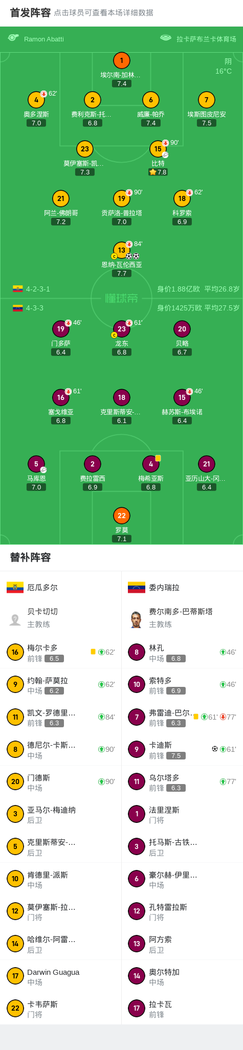 厄瓜多尔2-1委内瑞拉,恩纳-瓦伦西亚双响+丢点,卡迪斯建功