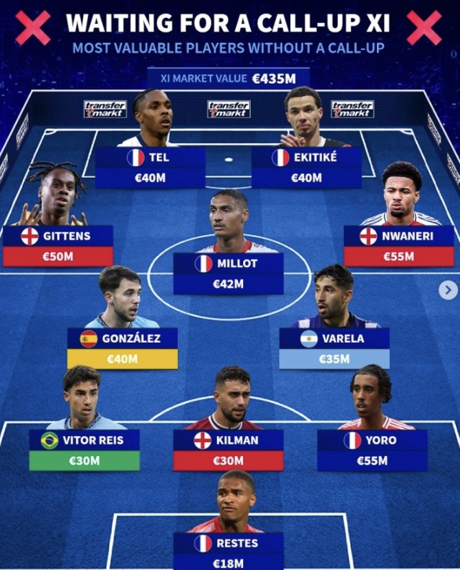 目前,最新一期国家队集训正在进行中。德国转会市场列出了未获得国家队征召的当前最贵阵容,法国5人在列。