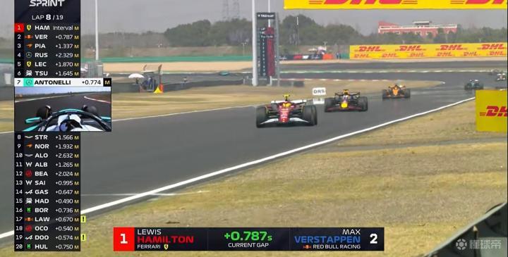 第8圈时,维斯塔潘和汉密尔顿之间的差距已经缩小到了1秒以内。