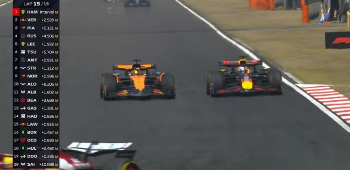 第14圈,皮亚斯特里相继在14弯和第1弯对维斯塔潘进行攻击,但是未能超越对手。