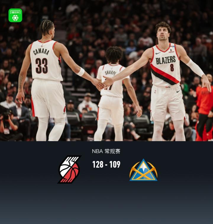 第四节开拓者阿夫迪亚拿下12分,掘金小波特拿下8分,最终开拓者128-109战胜掘金