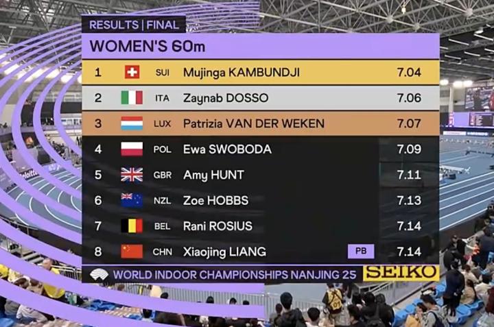 室内田径世锦赛女子60米:梁小静7秒14创个人最佳成绩位列第8我的靴子里面有蛇 @懂球帝2025-03-22 21:253月22日,室内田径世锦赛女子60米决赛,中国选手梁小静7秒14创造个人最好成绩,位列第8。预赛和半决赛中,梁小静两次跑出7秒17,追平个人最好成绩。半决赛她排名小组第三,成功递补晋级决赛。决赛中,梁小静跑出7秒14,创造个人最好成绩,位列第8。瑞士选手坎布吉夺金,意大利选手多索拿到银牌,卢森堡选手韦肯获得铜牌。展开更多