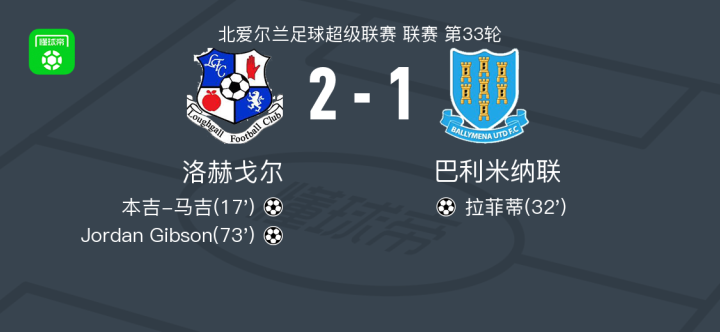 北京时间3月22日,北爱尔兰足球超级联赛第33轮展开争夺,洛赫戈尔坐镇主场迎战巴利米纳联。比赛开始后,双方迅速进入状态。洛赫戈尔凭借本吉-马吉的进球率先取得领先。随后,巴利米纳联由拉菲蒂扳平比分。不甘平局的洛赫戈尔在比赛后半段发起猛攻,并由Jordan Gibson打入制胜一球。最终,洛赫戈尔以2-1战胜巴利米纳联,全取三分。