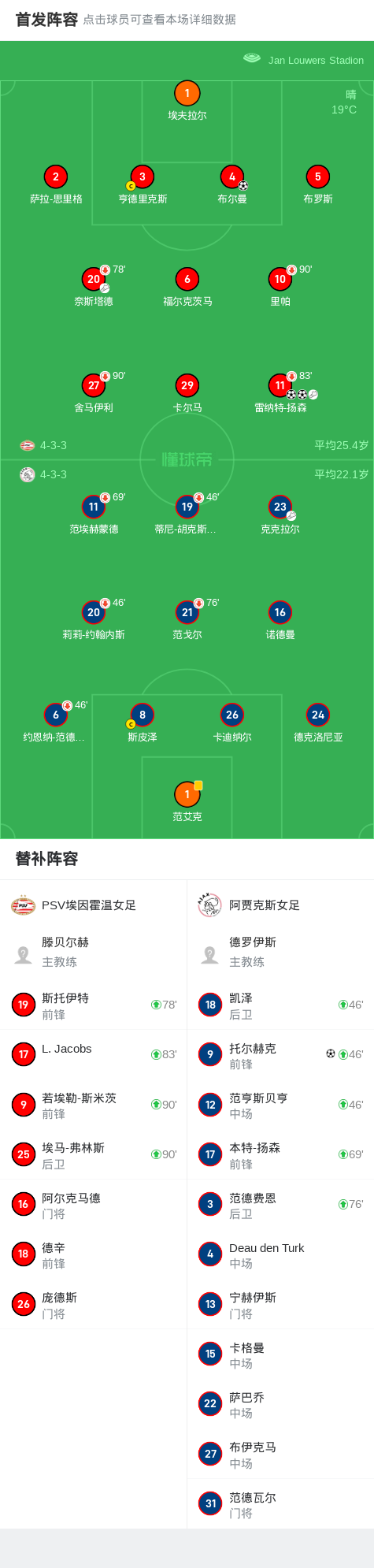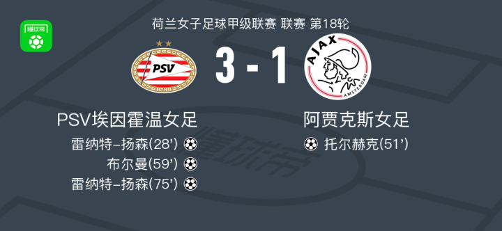 PSV埃因霍温女足3-1阿贾克斯女足,雷纳特-扬森两球,布尔曼破门