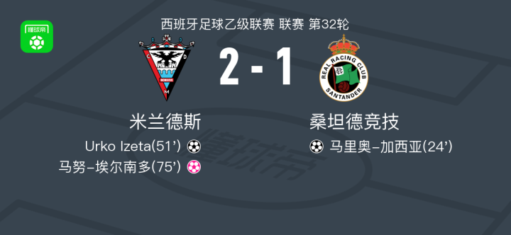 北京时间3月23日,西班牙足球乙级联赛第32轮,米兰德斯坐镇主场迎战桑坦德竞技。比赛中,桑坦德竞技由马里奥-加西亚率先取得进球,为球队打开局面。随后,米兰德斯展开反击,Urko Izeta接到队友胡安-古铁雷斯的助攻成功破门,将比分扳平。此后,桑坦德竞技的马努-埃尔南多不慎自摆乌龙,为主队送上大礼。最终,米兰德斯以2-1战胜桑坦德竞技,全取三分。