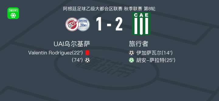 北京时间3月23日,阿根廷足球乙级大都会区联赛秋季联赛第8轮展开争夺,UAI乌尔基萨主场迎战旅行者。比赛开始后,旅行者迅速占据主动,伊加萨瓦尔为球队首开纪录。随后,UAI乌尔基萨的Valentín Rodríguez因严重犯规被罚下场,旅行者抓住机会由胡安-萨拉特通过点球扩大领先优势。尽管UAI乌尔基萨在比赛后段扳回一城,但未能改变战局。最终,旅行者客场以2-1战胜UAI乌尔基萨,全取三分。