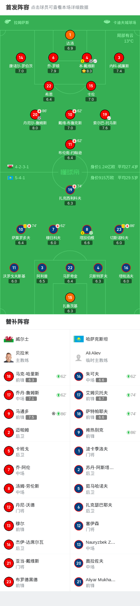 威尔士3-1哈萨克斯坦,詹姆斯闪击,本-戴维斯头球建功