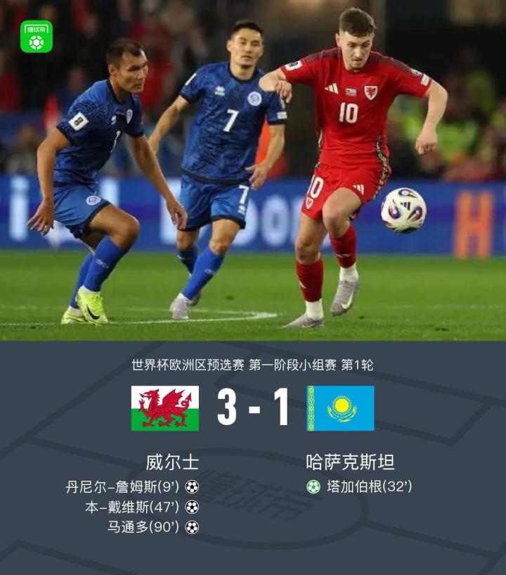 世界杯欧洲区预选赛第一阶段小组赛首轮迎来一场较量,威尔士与哈萨克斯坦展开争夺。比赛中,威尔士率先取得领先,丹尼尔-詹姆斯接本-戴维斯的妙传成功破门。随后,哈萨克斯坦通过点球机会由塔加伯根将比分扳平。不过,威尔士迅速再次取得优势,本-戴维斯在队友索尔巴-托马斯的助攻下打入一球。比赛尾声阶段,马通多锦上添花为威尔士锁定胜局。最终,威尔士以3-1战胜哈萨克斯坦,取得开门红。