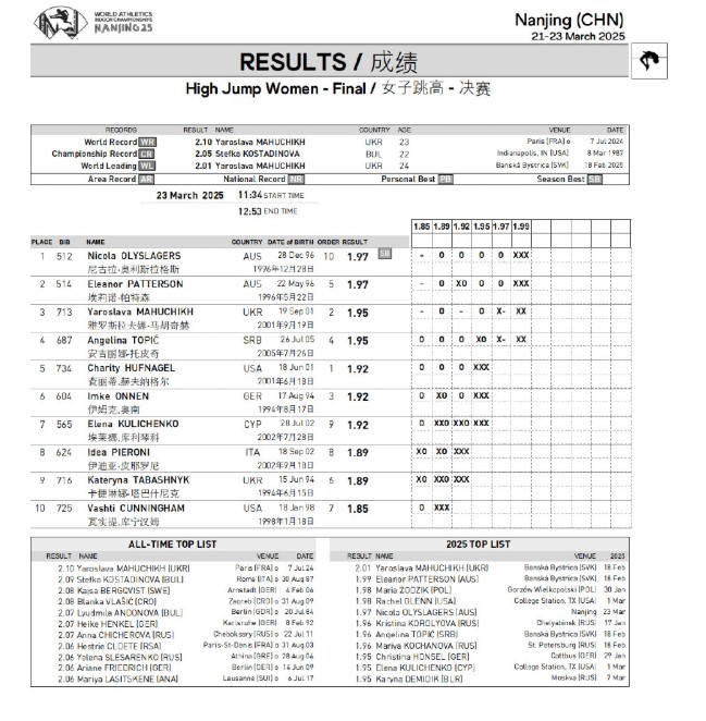 3月23日,2025年世界室内田径锦标赛女子跳高项目结束争夺,澳大利亚选手包揽冠亚军,巴黎奥运会女子跳高冠军、乌克兰选手玛胡奇克获得季军。