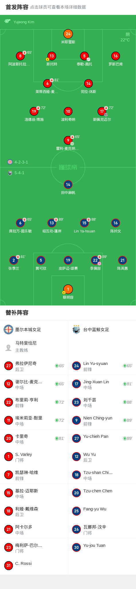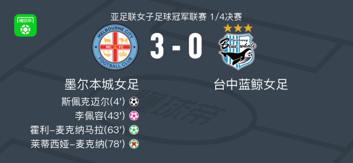 墨尔本城女足3-0大胜台中蓝鲸女足,霍利-麦克纳马拉点射破门,斯佩克迈尔建功