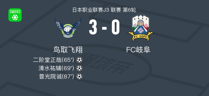 鸟取飞翔3-0大胜FC岐阜,普光院诚传射,清水祐辅破门