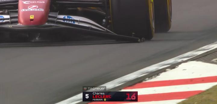 转播镜头多次给到勒克莱尔受损的前翼端板,不过勒克莱尔的速度看上去并未受损。