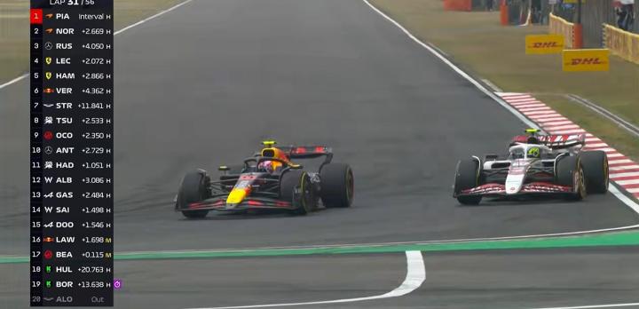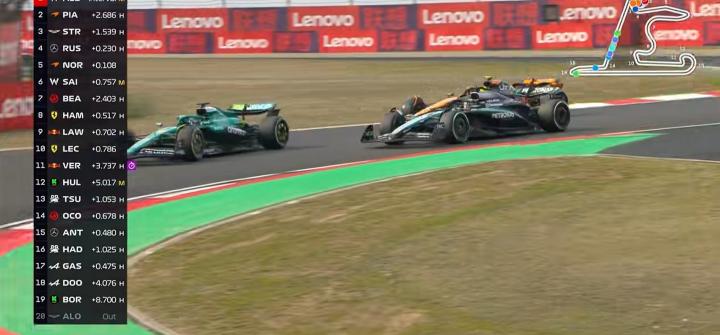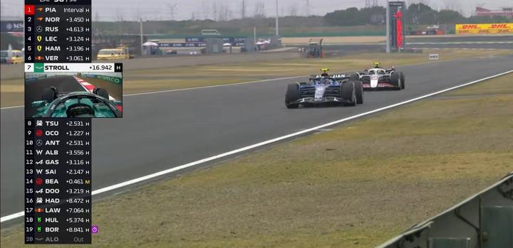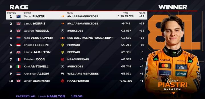 中国站正赛获得积分的车手依次是皮亚斯特里、诺里斯、拉塞尔、维斯塔潘、勒克莱尔、汉密尔顿、奥康、安东内利、阿尔本和贝尔曼。