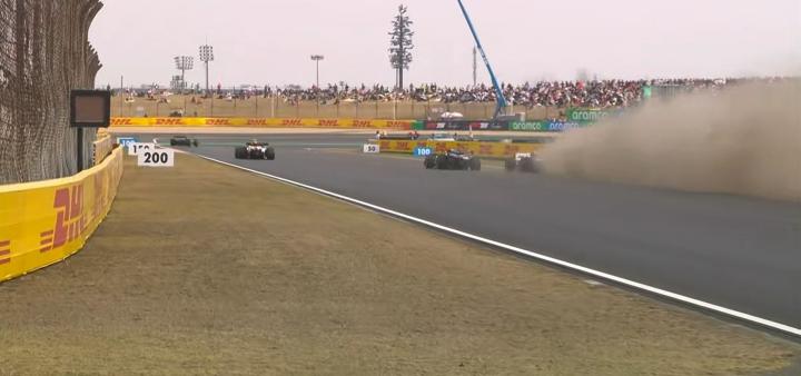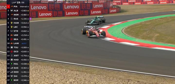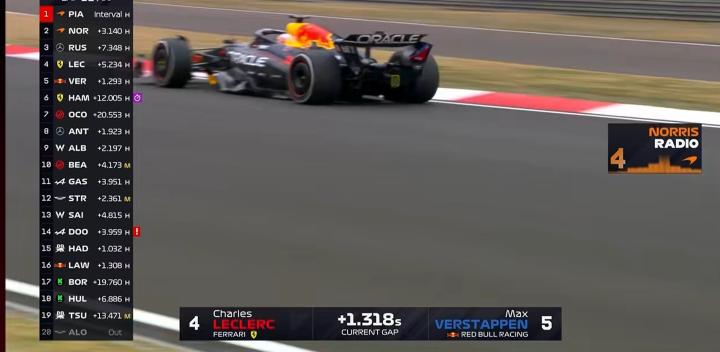 第一圈,诺里斯超越拉塞尔来到第二位。法拉利两台车辆双双超越维斯塔潘,来到第4和第5,不过勒克莱尔和汉密尔顿发生了碰撞,勒克莱尔的前翼受损。