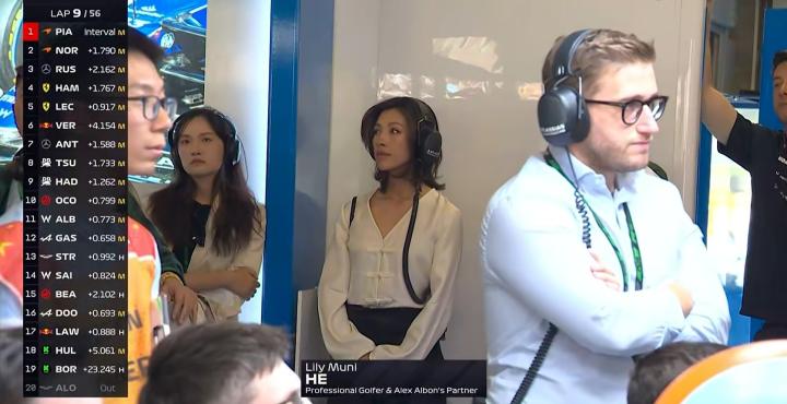 第9圈,镜头给到了现场观战的何沐妮(威廉姆斯车手阿尔本女友)