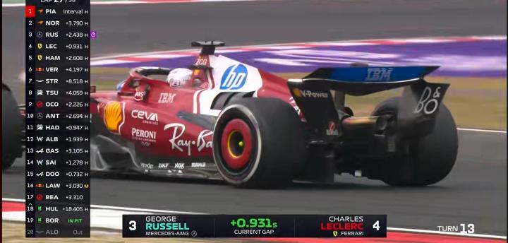 第27圈,勒克莱尔和拉塞尔的差距缩小到了1秒以内。
