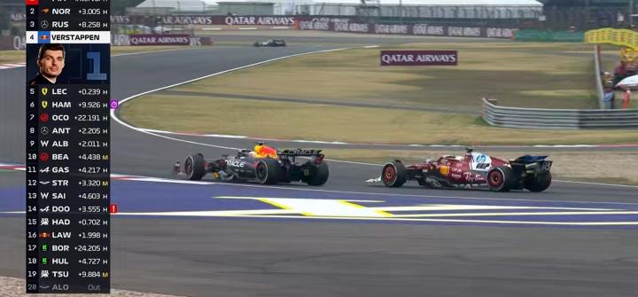 第53圈,维斯塔潘在第3弯实现精彩超车,完成了对勒克莱尔的超越,名次来到第4。