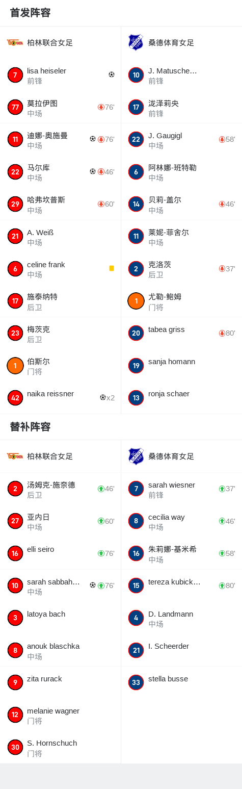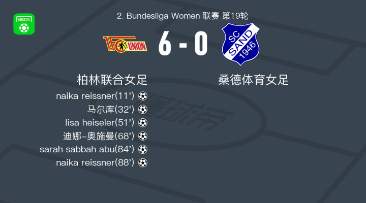 北京时间3月23日,2. Bundesliga Women联赛第19轮,柏林联合女足坐镇主场迎战桑德体育女足。比赛中,柏林联合女足多点开花,展现了强大的进攻火力。naika reissner表现出色,完成梅开二度;马尔库、lisa heiseler、迪娜-奥施曼以及sarah sabbah abu分别建功,帮助球队锁定胜局。最终,柏林联合女足以6-0的比分大胜桑德体育女足,全取三分。
