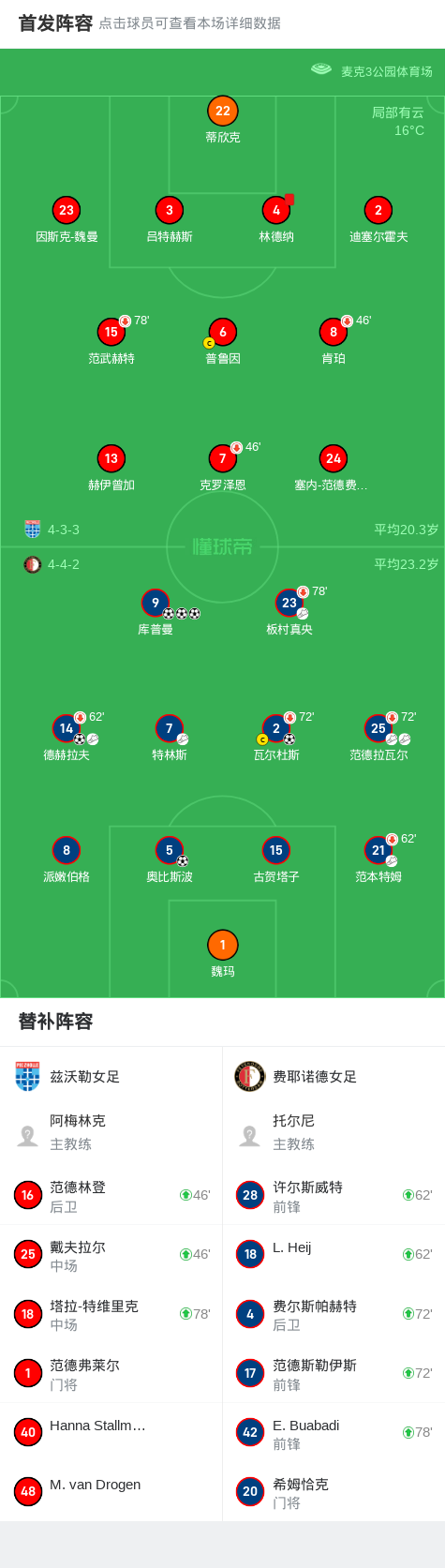 第18分钟,费耶诺德女足球员德赫拉夫助攻库普曼打入一球。