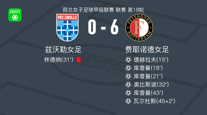在北京时间3月23日进行的荷兰女子足球甲级联赛第18轮比赛中,兹沃勒女足坐镇主场迎战费耶诺德女足。比赛开始后,费耶诺德女足迅速占据场上主动并连续制造威胁。德赫拉夫率先打破僵局为球队取得领先,随后库普曼在短时间内两次完成破门,帮助费耶诺德女足迅速扩大优势。不久之后,兹沃勒女足的一名球员因严重犯规被红牌罚下,使得主队在人数上处于劣势。利用这一有利局面,奥比斯波锦上添花再入一球。紧接着,库普曼再次展现个人能力,完成了本场比赛的帽子戏法。上半场即将结束时,瓦尔杜斯接队友助攻将比分定格为6-0。最终,费耶诺德女足以一场大胜从客场凯旋而归。