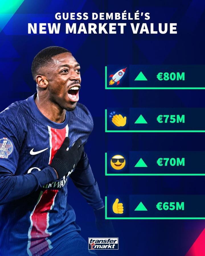 德国转会市场预热登贝莱身价上涨,并列出了四个可能的最新身价,分别是6500万欧、7000万欧、7500万欧和8000万欧。