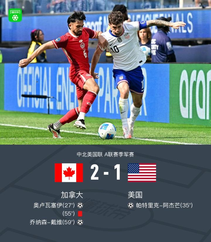 北京时间3月24日,中北美国联A联赛季军赛在加拿大与美国之间展开。比赛中,加拿大的奥卢瓦塞伊接到乔纳森-戴维的助攻成功破门,为球队取得领先。随后,美国的帕特里克-阿杰芒在队友迭戈-卢纳的协助下扳平比分。然而,加拿大在比赛中有一名队员因犯规被罚下场,但这一劣势并未影响他们的进攻节奏。乔纳森-戴维在阿里-艾哈迈德的帮助下再入一球,帮助加拿大再度超出比分。最终,加拿大以2比1战胜美国,夺得季军。