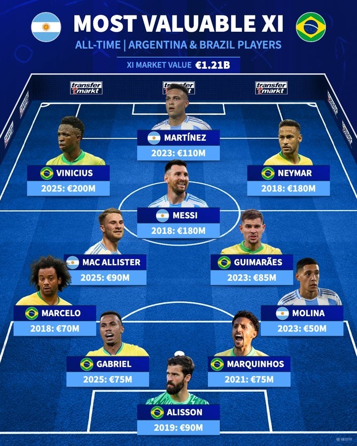 北京时间3月26日上午8点,阿根廷队将迎来世界杯南美区预选赛小组赛第14轮主场对阵巴西队的比赛,赛前,德国转会市场列出了两队历史身价最高球员组成的阵容。