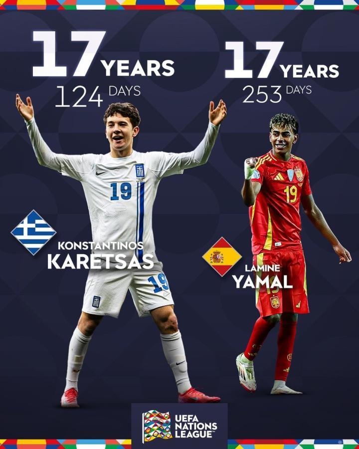 在希腊客场3-0击败苏格兰的欧国联升级附加赛中,17岁124天的希腊中场卡里萨斯成为欧国联历史最年轻的进球者,他打破了加维在2022年6月5日对阵捷克时创下的纪录(17岁304天)。