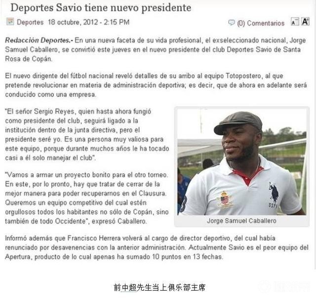 而随后的2012年卡巴雷罗成为了洪都拉斯萨维奥体育的新任俱乐部主席。