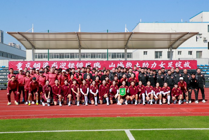 3月25日,中国女足国家队在重庆铜梁龙俱乐部训练基地集结备战,中国女足国家队将士们集体为今晚出战世预赛的中国男足国家队加油鼓劲。