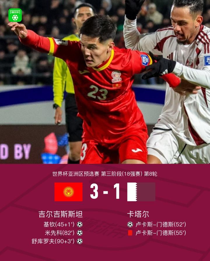 北京时间3月25日,世界杯亚洲区预选赛第三阶段(18强赛)第8轮,吉尔吉斯斯坦与卡塔尔展开较量。上半场补时阶段,基钦为吉尔吉斯斯坦打破僵局。下半场开始后,卢卡斯-门德斯为卡塔尔迅速扳平比分,但不久后卢卡斯-门德斯因严重犯规被红牌罚下。多打一人的吉尔吉斯斯坦抓住机会,米先科世界波建功,随后舒库罗夫再入一球锁定胜局。最终,吉尔吉斯斯坦以3-1战胜十人卡塔尔。