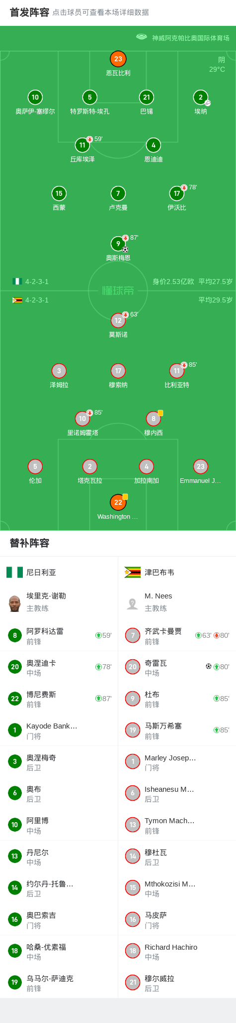 尼日利亚1-1津巴布韦,埃纳助攻奥斯梅恩破门,奇雷瓦绝平