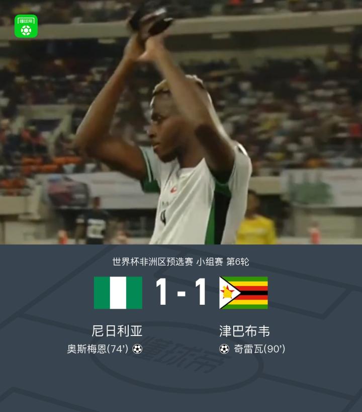 世界杯非洲区预选赛小组赛第6轮,尼日利亚与津巴布韦展开较量。上半场埃纳传中,奥斯梅恩头球破门,比赛最后时刻奇雷瓦完成绝平。最终尼日利亚1-1战平津巴布韦。
