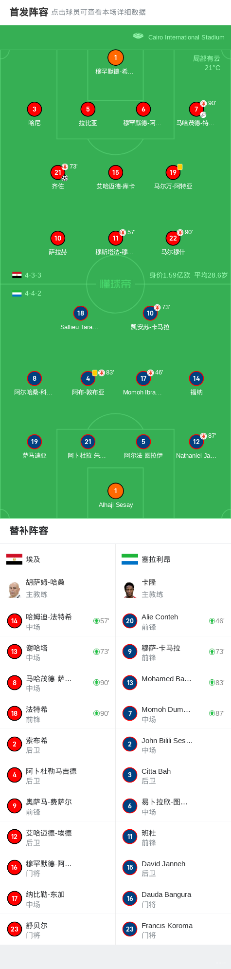世界杯非洲区预选赛小组赛第6轮,埃及与塞拉利昂展开较量。比赛中,马哈茂德-特雷泽盖送出助攻,齐佐成功取得进球,为埃及打破场上僵局。最终,埃及以1-0的比分战胜塞拉利昂。