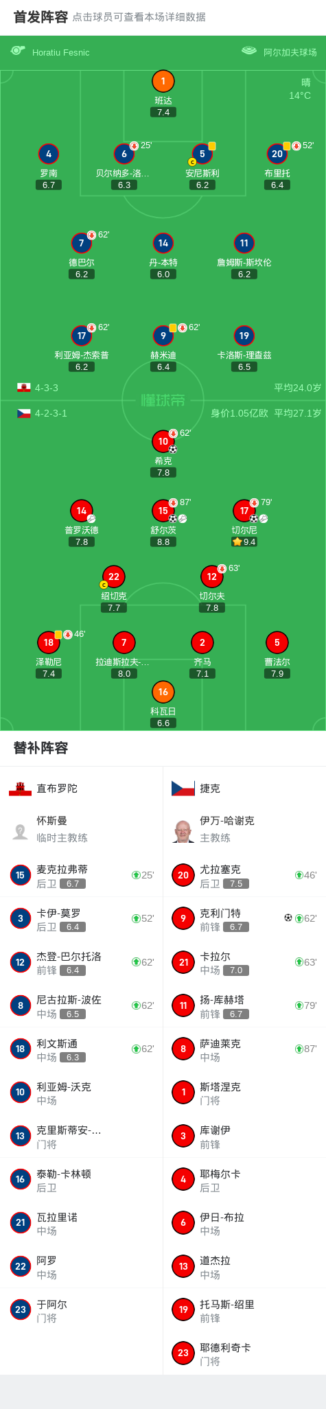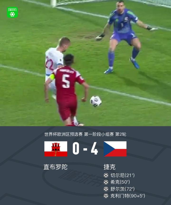 世界杯欧洲区预选赛第一阶段小组赛第二轮,直布罗陀迎战捷克。比赛中,切尔尼率先建功,随后希克接到切尔尼的助攻扩大比分,舒尔茨锦上添花,补时阶段克利门特锁定胜局。最终,捷克以4比0战胜直布罗陀。