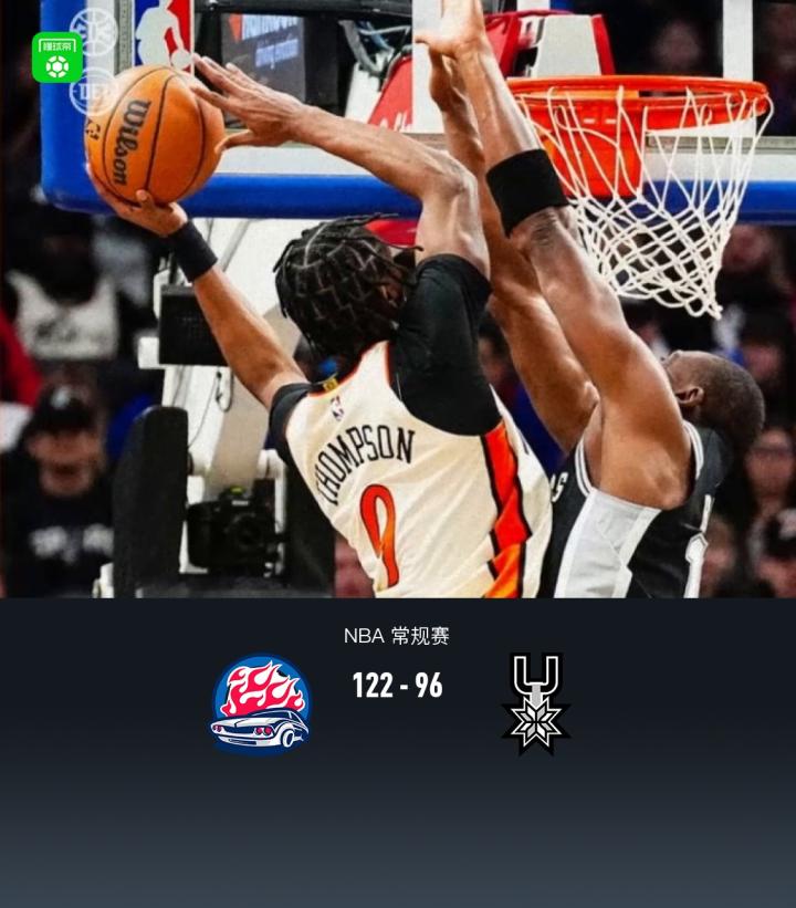第四节活塞萨瑟拿下8分,马刺凯尔登-约翰逊拿下8分,最终活塞122-96战胜马刺