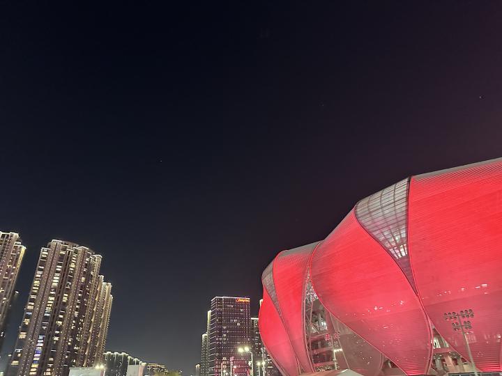 从一条轨道到另一条轨道,最后在奥体中心地铁站走到室外,大莲花映入眼帘。