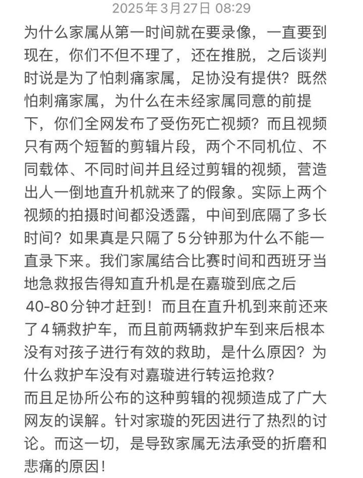 “我们结合比赛时间和西班牙当地急救报告得知直升机是在嘉璇倒地之后40-80分钟才赶到。而且在直升机到来前还来了4辆救护车,但前2辆救护车到来后根本没对孩子进行有效救助。足协所公布的这种剪辑的视频造成了广大网友的误解。针对家璇的死因的讨论,是导致家属无法承受的折磨和悲痛的原因。”