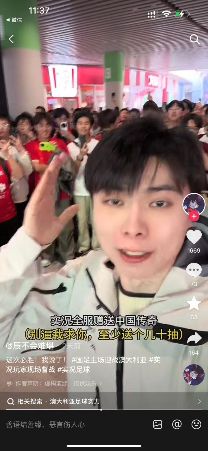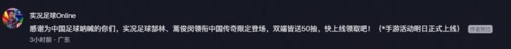 我没想到,居然有这么多同好和我一样,想在游戏中复刻国足昔日荣光。“郜林来现在的国足能进几个球?”“蒿俊闵来这支国足能踢单后腰吗?”的讨论让人看得心潮澎湃,“谁抽到了?手感如何啊?类的急切期待,让人很难按捺冲动。更让我意外的是,世预赛主场一战,有社牛玩家在场外大胆喊话,希望实况赠送中国传奇。正当我以为这是一次普通的整活时,实况官方竟然亲自回应了:送!还要多送!不管输赢都送!把原定的30连抽加码升级成了50连抽!