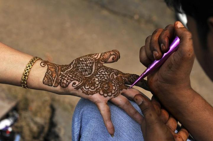 印度新德里,一个女孩正在用指甲花颜料描绘图案