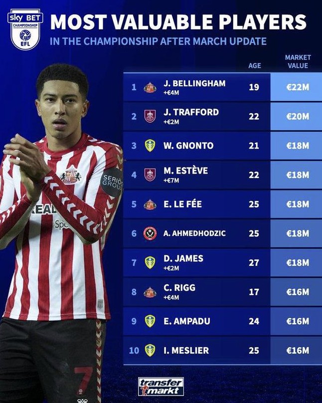 德转列英冠球员身价排名:乔布-贝林厄姆领跑,利兹联4人上榜
