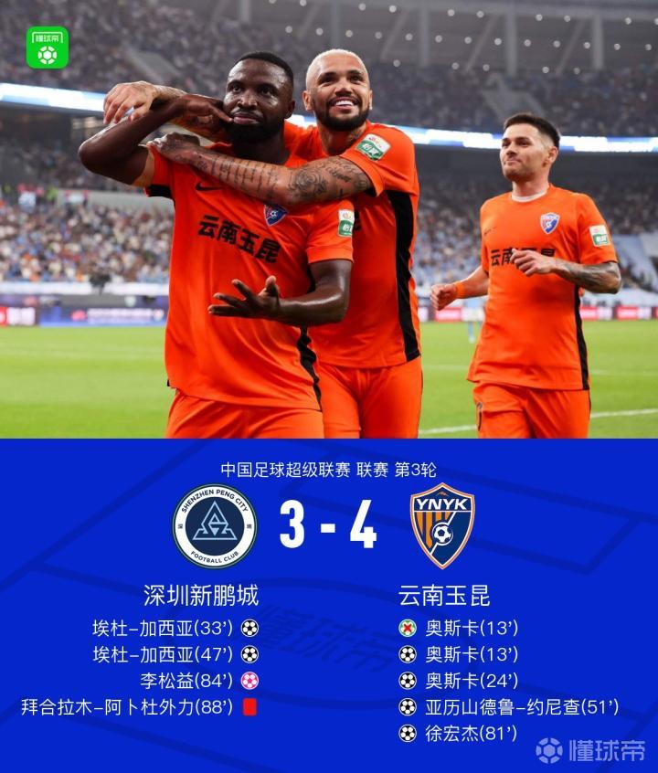 北京时间3月28日,中国足球超级联赛第3轮,深圳新鹏城主场迎战云南玉昆。上半场,胡睿宝送点,奥斯卡主罚被扑后补射得手,约尼查助攻奥斯卡梅开二度,奥斯卡巧射破门被判越位进球无效,张昱杰助攻加西亚扳回一球;下半场,加西亚破门同样梅开二度,约尼查精彩过人后兜射破门,徐宏杰得球打门入网,杨一鸣头球摆渡造成李松益自摆乌龙,拜合拉木拳打李松益肚子被直红罚下。最终,深圳新鹏城以3-4不敌云南玉昆。