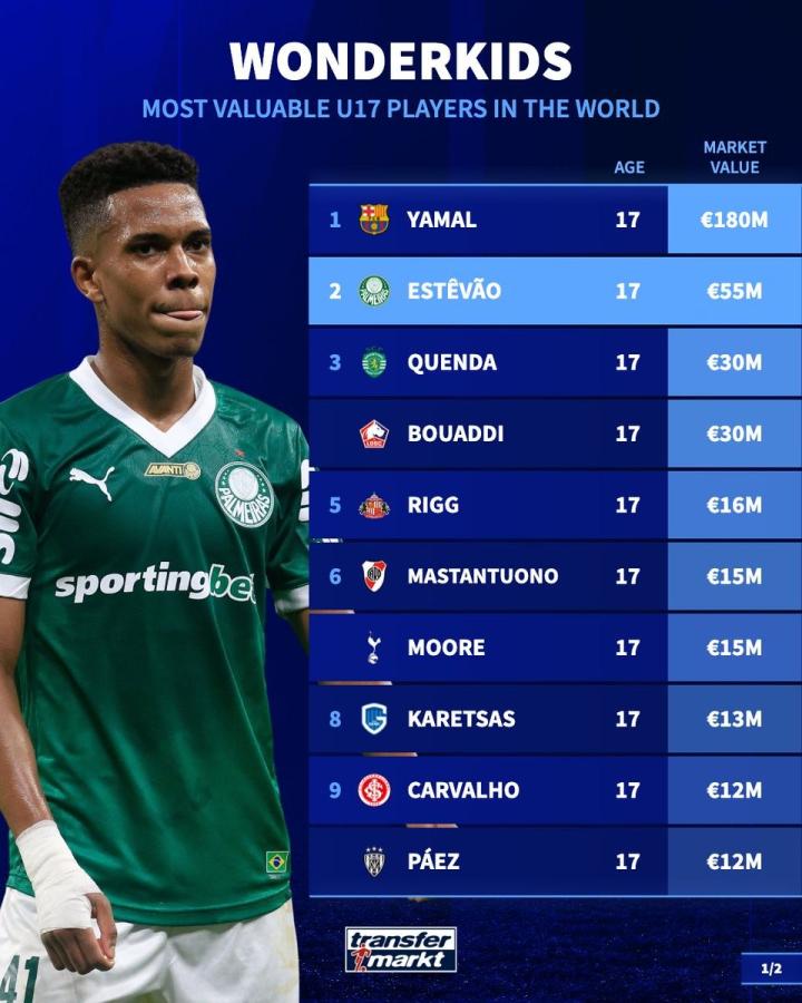 此外,埃斯特旺也是目前世界足坛身价第二高的U17球员,仅次于巴萨前锋亚马尔(1.8亿欧)。