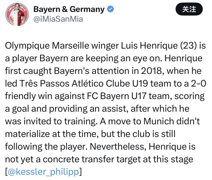 在社交媒体上,凯斯勒写道:马赛边锋路易斯-恩里克是拜仁长期关注的球员。