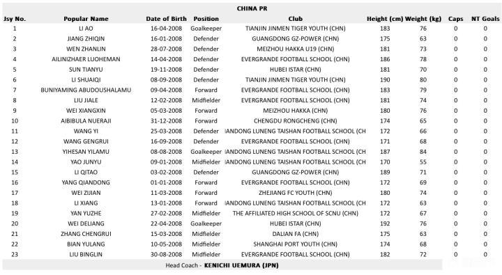前锋:7-布尼亚明-阿不都沙拉木(恒大足球学校)、9-魏祥鑫(梅州客家)、10-艾比布拉-努尔阿吉(成都蓉城)、16-杨黔东(恒大足球学校)、17-魏子健(浙江青年队)、18-李翔(山东鲁能泰山足球学校)