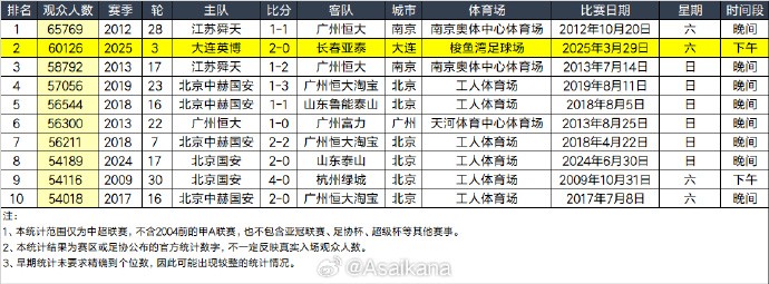 据朱艺消息,这一数据在中超历史上排名第二,仅次于2012年南京奥体的65769人。这也是继那场之后中超联赛第二次有超过六万名观众现场观赛。