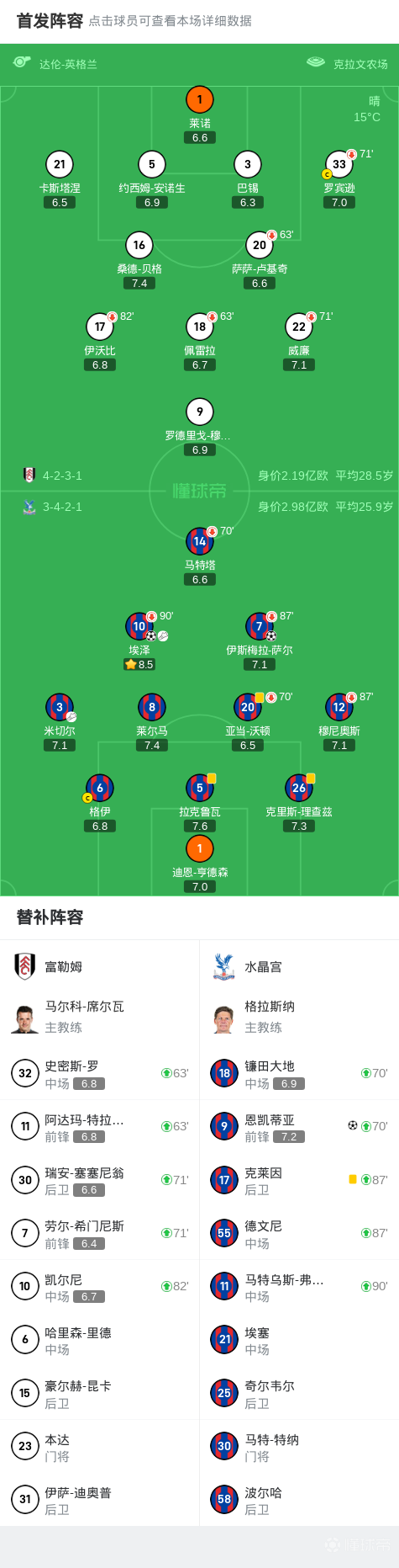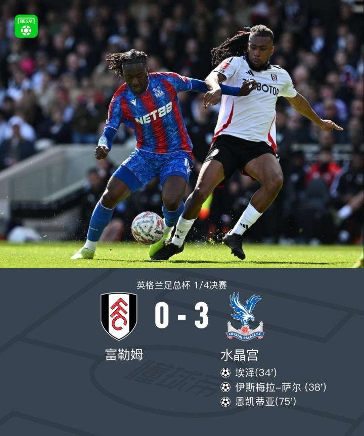 英格兰足总杯1/4决赛,富勒姆对阵水晶宫。比赛中,水晶宫凭借埃泽的进球取得领先,随后埃泽助攻伊斯梅拉-萨尔扩大比分,恩凯蒂亚在比赛后段再下一城锁定胜局。最终,水晶宫以3比0战胜富勒姆,成功晋级下一轮。
