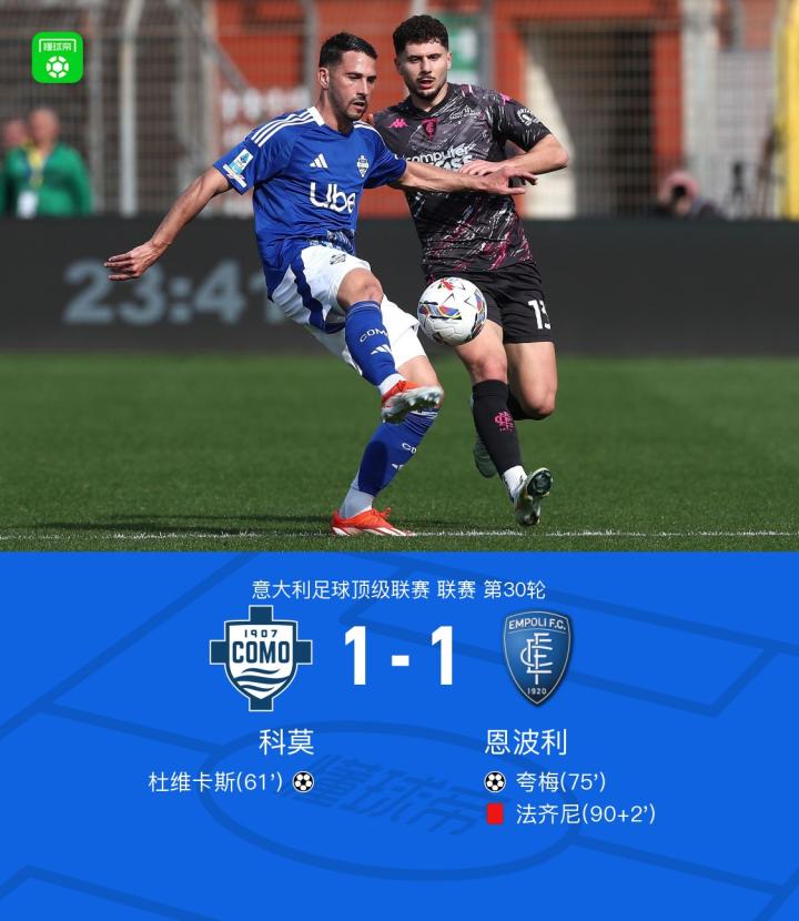 北京时间3月29日,意大利足球顶级联赛第30轮,科莫主场迎战恩波利。比赛中,科莫由杜维卡斯取得进球,为球队打破僵局。恩波利则凭借夸梅的进球扳平比分。下半场补时阶段,恩波利球员法齐尼被出示红牌罚下。最终,双方以1-1的比分握手言和。