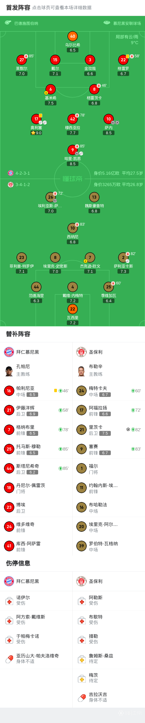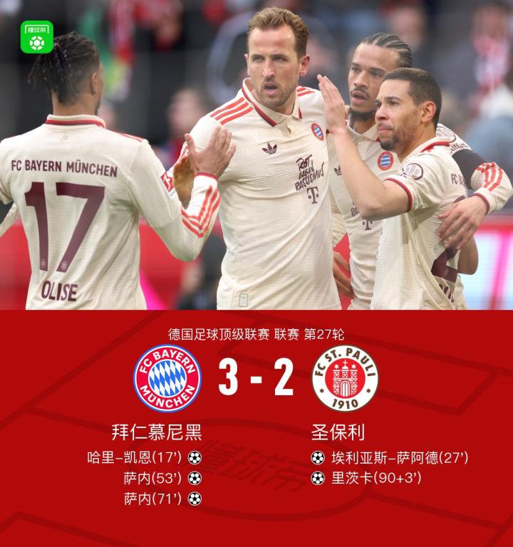 北京时间3月29日德甲联赛第27轮,拜仁慕尼黑主场迎战圣保利。上半场,哈里-凯恩为拜仁首开纪录,完成了对德甲球队的通杀,萨阿德扳平比分;下半场,奥利塞助攻双响,萨内梅开二度,替补登场的伊藤洋辉伤退,补时阶段,里茨卡扳回一城。最终,拜仁慕尼黑3-2险胜圣保利。